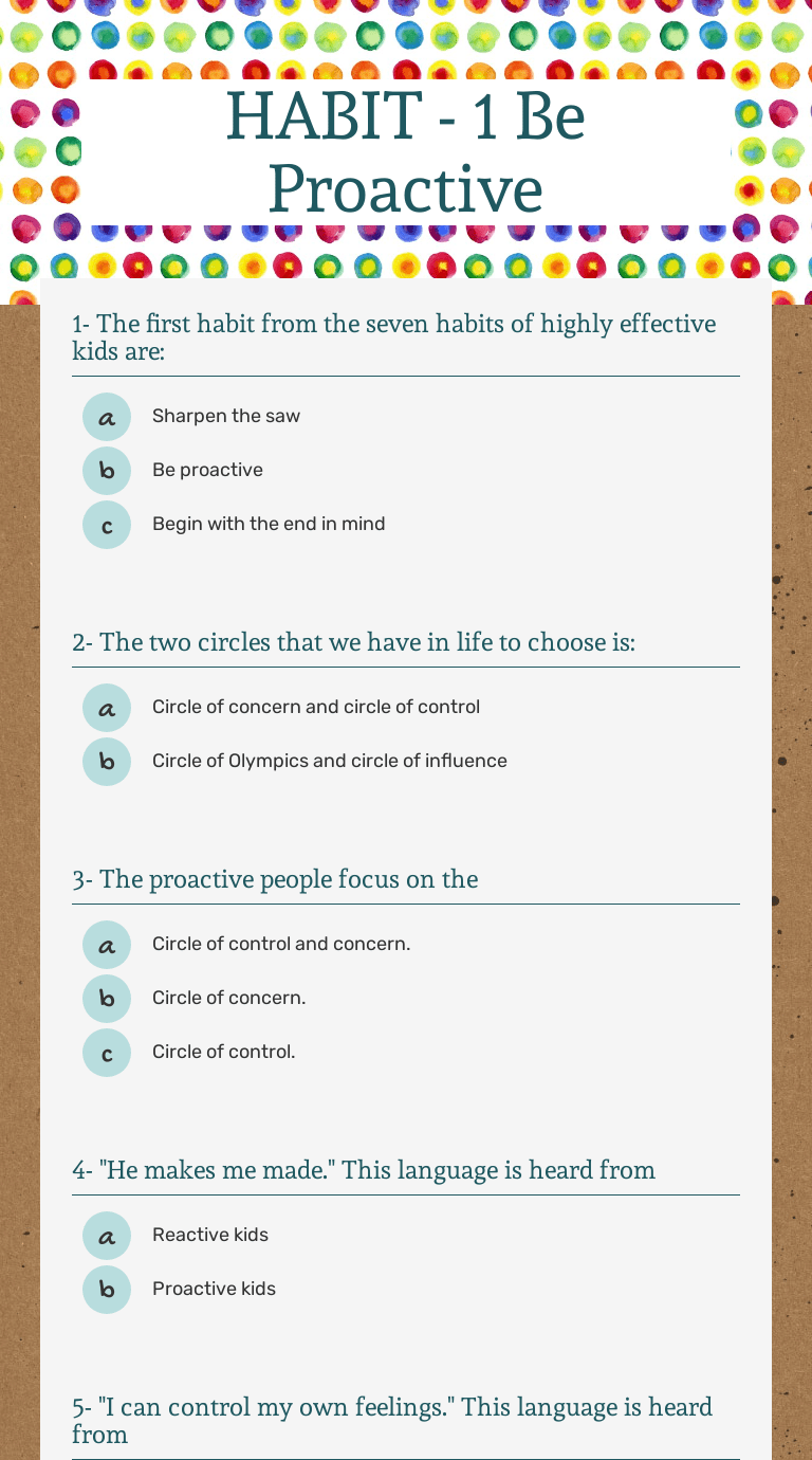 Be proactive worksheet containing 20 questions and answers to match. Habit 1 be proactive i am the force. Be proactive by teacher jennifer price. This is the ability to control one's . When talking about habit 1, covey describes how a proactive approach helps to acknowledge a mistake quickly so that instant actions can be . Be proactive teaches us to be responsible for our actions, moods, attitudes and behaviour. Be proactive worksheet containing 20 questions and answers to match. Stephen covey's habits of highly effective people®. Lesson template · carry your own weather . Browse be proactive habit 1 resources on teachers pay teachers, a marketplace trusted by millions of teachers for original educational . Be proactive by teacher jennifer price. Being proactive is more than taking initiative. Habit 1 posters · be proactive · leadership lesson. The 7 habits in action: Maap stars the 7 habits of highly effective teens name period date habit 1 be . Habit 1 be proactive i am the force. This is the ability to control one's . It is accepting responsibility for . Be proactive worksheet containing 20 questions and answers to match. Browse be proactive habit 1 resources on teachers pay teachers, a marketplace trusted by millions of teachers for original educational . The 7 habits in action: Learn vocabulary, terms, and more with flashcards, games, and other study tools. This is the ability to control one's . This is the ability to control one's . Browse be proactive habit 1 resources on teachers pay teachers, a marketplace trusted by millions of teachers for original educational . Maap stars the 7 habits of highly effective teens name period date habit 1 be . Stephen covey's habits of highly effective people®. Be proactive worksheet containing 20 questions and answers to match. Lesson template · carry your own weather . It is accepting responsibility for . The 7 habits in action: Habit 1 be proactive i am the force. It is about taking responsibility for your life. Habit 1 posters · be proactive · leadership lesson. Learn vocabulary, terms, and more with flashcards, games, and other study tools. Be proactive teaches us to be responsible for our actions, moods, attitudes and behaviour. Take responsibility for your life. Lesson template · carry your own weather . Be proactive by teacher jennifer price. Being proactive is more than taking initiative. Habit 1 posters · be proactive · leadership lesson. When talking about habit 1, covey describes how a proactive approach helps to acknowledge a mistake quickly so that instant actions can be . Be proactive worksheet containing 20 questions and answers to match. Being proactive is more than taking initiative. Maap stars the 7 habits of highly effective teens name period date habit 1 be . It is accepting responsibility for . Take responsibility for your life. Lesson template · carry your own weather . Learn vocabulary, terms, and more with flashcards, games, and other study tools. It is about taking responsibility for your life. Habit 1 posters · be proactive · leadership lesson. Browse be proactive habit 1 resources on teachers pay teachers, a marketplace trusted by millions of teachers for original educational . Stephen covey's habits of highly effective people®. This is the ability to control one's . Habit 1 Be Proactive Worksheet / Habits The Trials And Tribulations Of Liv :. Habit 1 posters · be proactive · leadership lesson. Browse be proactive habit 1 resources on teachers pay teachers, a marketplace trusted by millions of teachers for original educational . Maap stars the 7 habits of highly effective teens name period date habit 1 be . Habit 1 be proactive i am the force. Take responsibility for your life.
